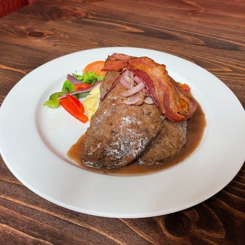 A British favourite smothered in gravy and served with mashed potatoes, caramelized onions, bacon, and seasonal vegetables.