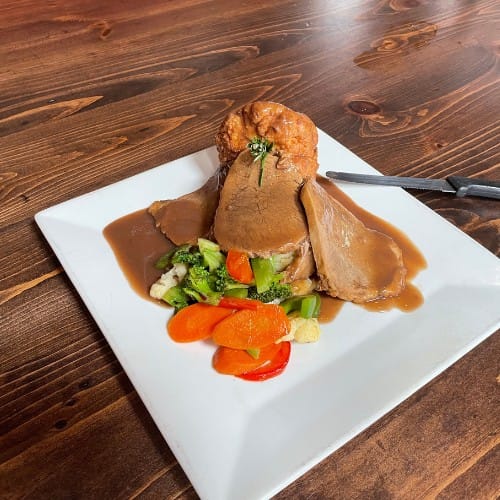 Red wine braised roast beef topped with demi glaze and served inside our homemade Yorkshire pudding with mashed potatoes & seasonal vegetables.