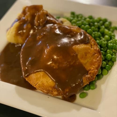 Tender chunks of steak and button mushrooms simmered in a rich red wine gravy. Served with mashed potatoes and buttered green peas.