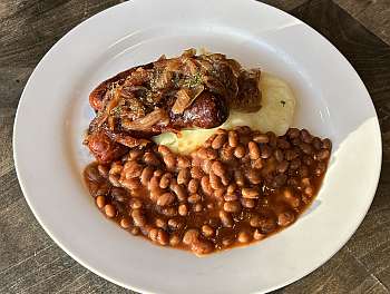 Oven roasted English bangers topped with a caramelized onion gravy, served over Yukon gold mashed potatoes with baked beans
