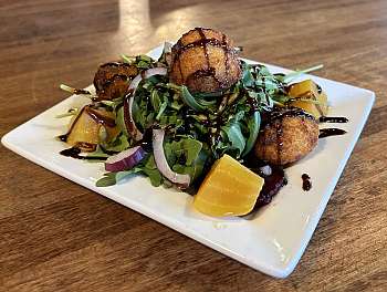 panko fried goat cheese & roasted baby beets over baby arugula with sweet red onions and pumpkin seeds, drizzled with balsamic reduction and honey
