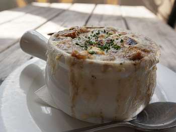 Chef's home made rich beef and red wine broth simmered with caramelized onions and topped with garlic crostinis & broiled Swiss cheese