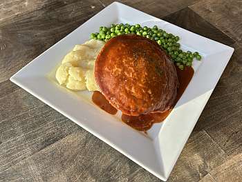 Minced beef & lamb pie topped with rich gravy & served with Yukon gold mashed potatoes & buttered peas