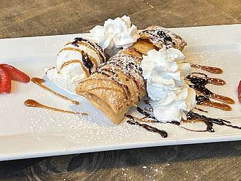 Chocolate and caramel bar wrapped in a tortilla and deep fried until crispy. Finished with French vanilla ice cream, chocolate and caramel sauces