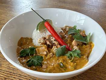 Medley of fresh vegetables simmered in a rich yellow Thai curry sauce over jasmine rice, finished with cashews, cilantro, and lime